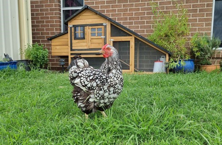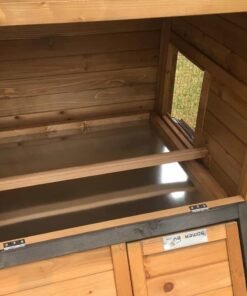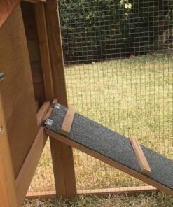 With an external handle to open and shut the door to the house, this chicken coop also comes with perch and non slip ramp up to the enclosed sleeping area/nest box.